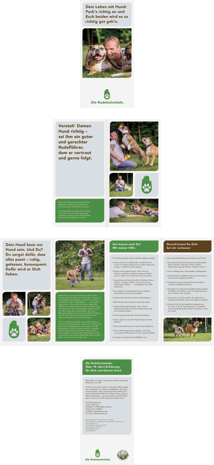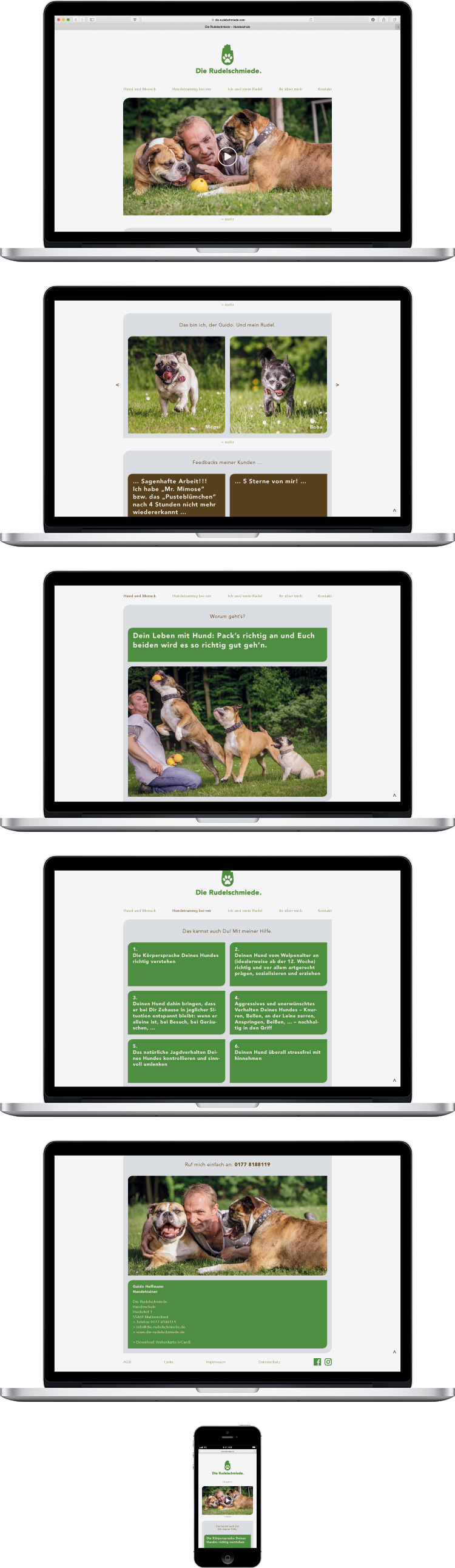 Unsere Zusammenarbeit begann mit einem Workshop. Ergebnis: Für Guido Hoffmann bedeutet Hundetraining mehr als das Konditionieren von Hunden. In seinem Fokus steht die Bildung eines intakten Rudels. Daher positionierten wir seine Hundeschule als Schmiede für eine starken Beziehung zwischen Mensch und Hund, in der es „beiden so richtig gut geht“. Aus dieser Entscheidung heraus entwickelten den Namen „Die Rudelschmiede“ sowie ein Startpaket bestehend aus Logo, Visitenkarte, Flyer und Webseite. Die Reaktionen vieler Hundebesitzer gab unserer Entscheidung Recht. Schon im zweiten Monat nach Veröffentlichung der ersten Kommunikationsmaßnahmen war Guido Hoffmann komplett ausgebucht.